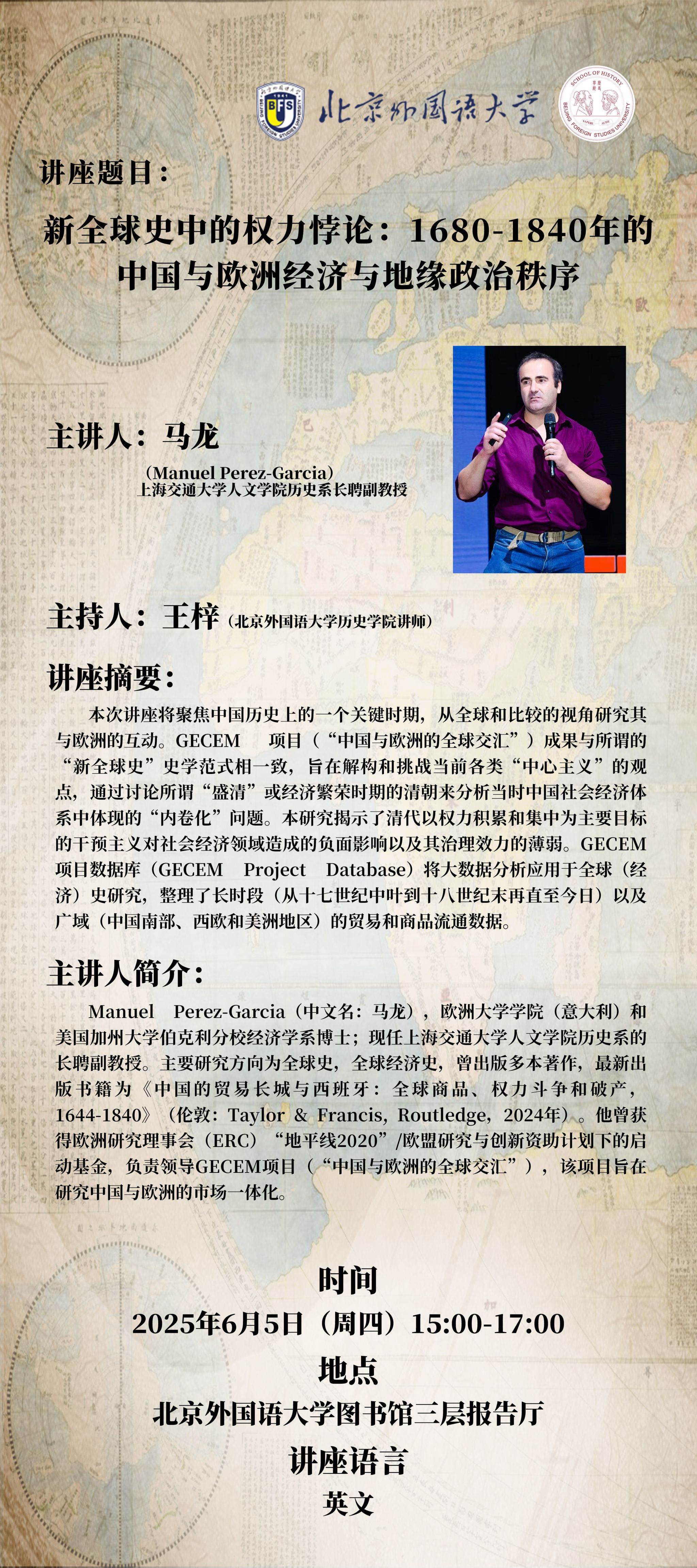 主讲人:Manuel Perez-Garcia(中文名:马龙)上海交通大学人文公司历史系长聘副教授