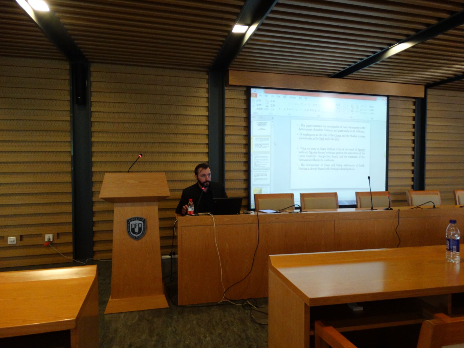 通过本次讲座,韦伯研究员向同学们分享了他的研究结论:占人和马来人的军事和民用贡献是参加镇压高棉叛乱和从事贸易及农业的开发。随着法国在越南统治的扩大,1867年南越地区的殖民才被废除,但占人和马来人在西宁和朱笃地区的影响依然存在,一些老一辈人仍然知道定居点的起源,认为他们是被用作“人类篱笆”。本场讲座视野开阔,同学们表现出很大的兴趣,获得在场听众的一致好评,在掌声中圆满结束。