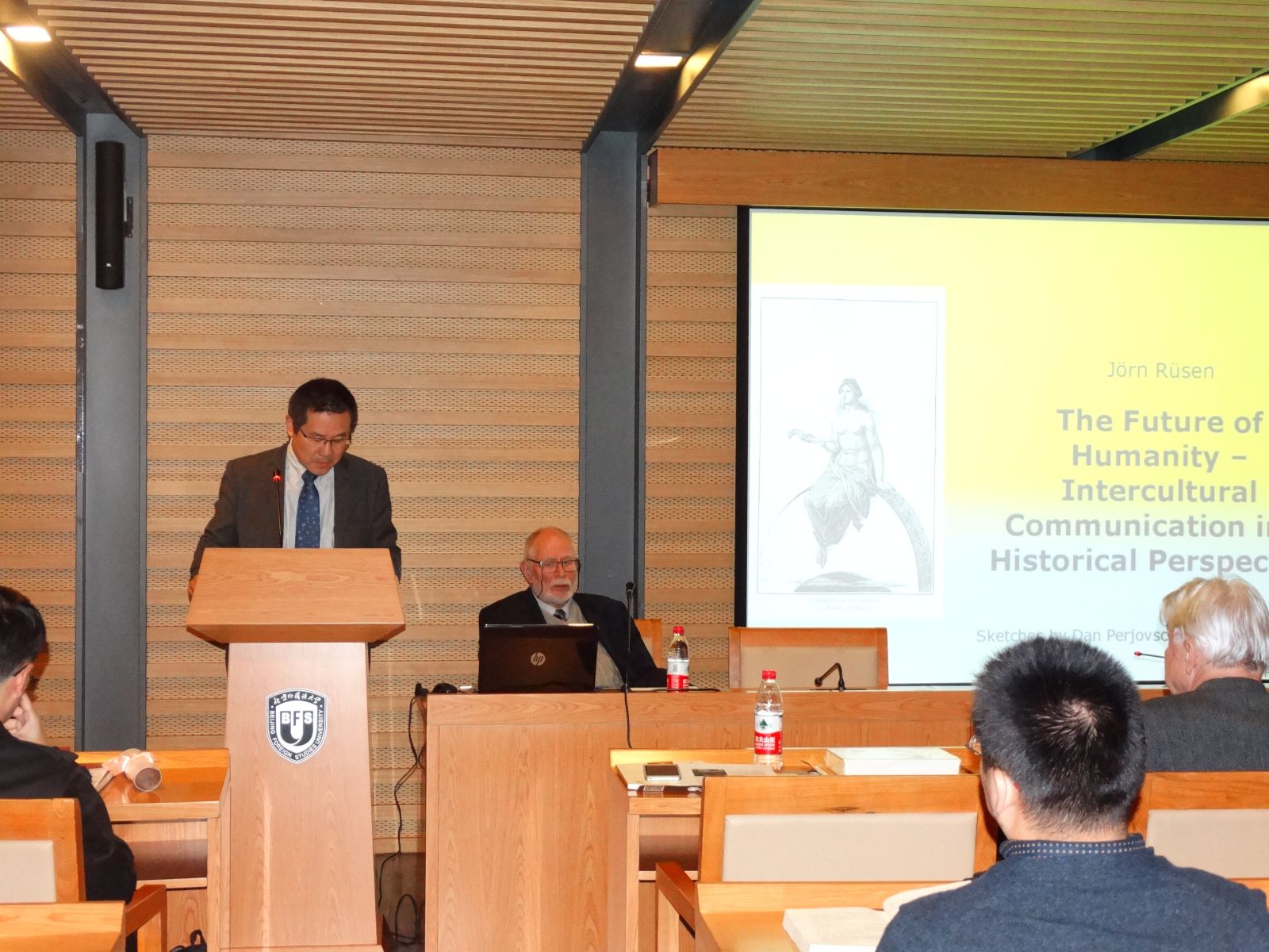 接下来,吕森教授畅谈了他对于历史哲学和人类化(humanization)的认识。他详细阐述了历史哲学的三个维度:物质维度,即文化演变;形式维度,即历史表现;功能性维度,即记忆的叙述,这三者之间互相统属,需要相互协调,对三者之间的关系问题至今很少有人思考。他还描述了历史哲学的基础——人类学的普遍意义,他指出造成人类生活中变化和发展的普遍因素是张力,上层和底层之间的张力构成了社会的等级秩序,它要求公正和社会认可的观念;朋友和敌人间的张力会建立起政治,它要求和平的观念;穷人和富人间的张力决定经济,它要求充分供给的观念;善和恶之间的张力形成了人类生活的道德范畴,它要求人类行为具有道德观念。使人类生活处于这些生存张力中的观念要与“现在”相关联才能具有时间性。那么历史就告诉我们了未来可能发生之事,人类为何以及如何改变事物,这样改变才能变成发展。包含着所有这些个别观念的发展观我们可以给它下个定义,即“人类化”观念。历史正是一个全面的“人类化”过程。而“人类化”是一个从排外走向融入的过程,它经历了以种族人性为特征的古代文化,以排外为普遍人性特征的轴心时代文化和以融入为普遍人性特征的近代文化三个阶段,吕森教授提出我们今天在学术、艺术和宗教领域的任务就是创造具有融入性的差异观念。
