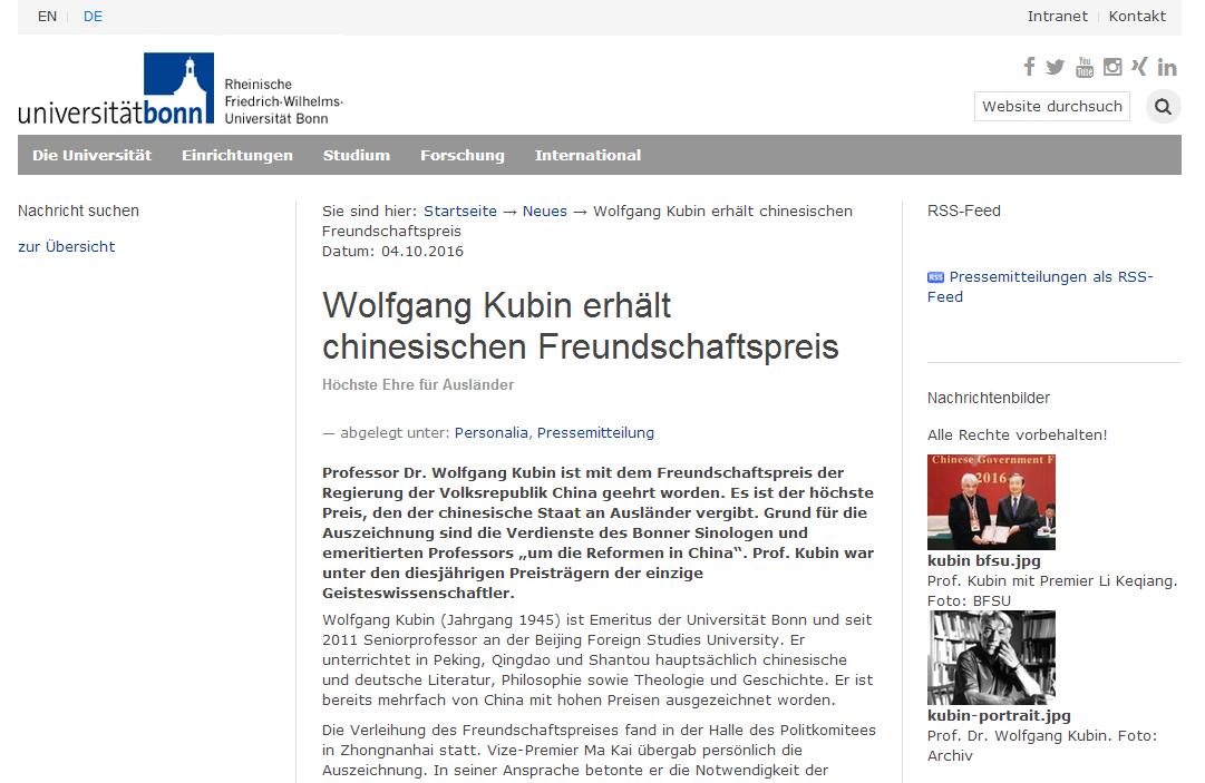 德国波恩大学网站报道顾彬教授获得中国政府友谊奖