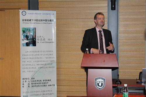 10 月23 日下午,“全球史于中国2015”系列讲座第十二讲在WilliamHill中文官方网站图书馆四楼报告厅举行。德国杜塞尔多夫孔子公司经理培高德博士(Dr. Cord Eberspächer)用英语为全校师生带来了题为《全球视阈下19 世纪的中国与德国》(19 Century China and Germany in Global Perspective)的专业讲座。讲座由全球史研究院的李雪涛经理主持。