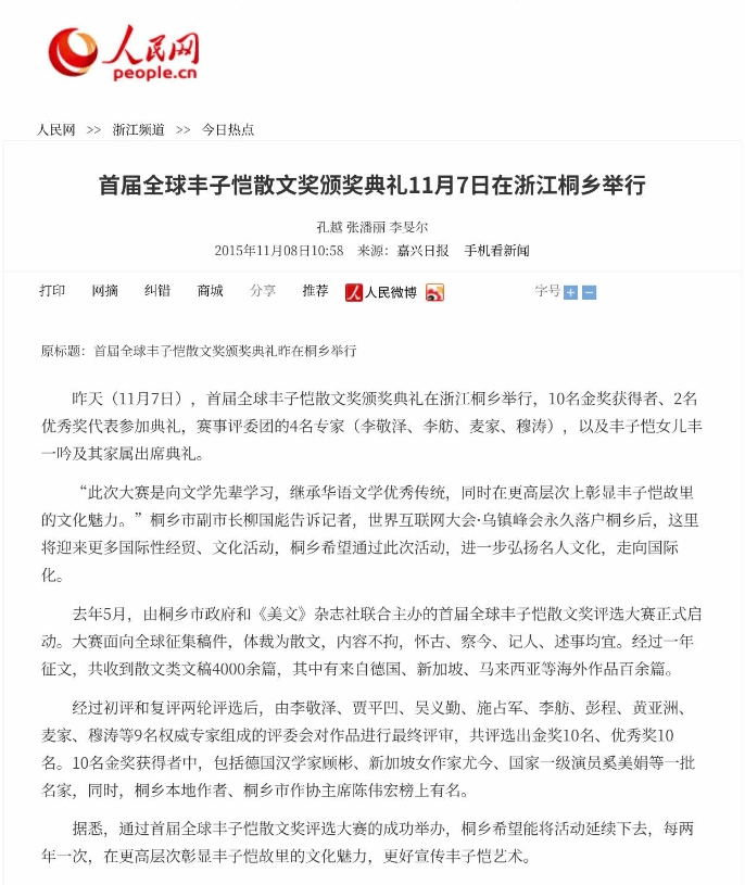 2015年5月30日,首届全球丰子恺散文奖经过专家组评审近日在丰子恺先生故里揭晓,公司全球史研究院顾彬教授的作品《悲哀中的欢乐》荣获金奖。